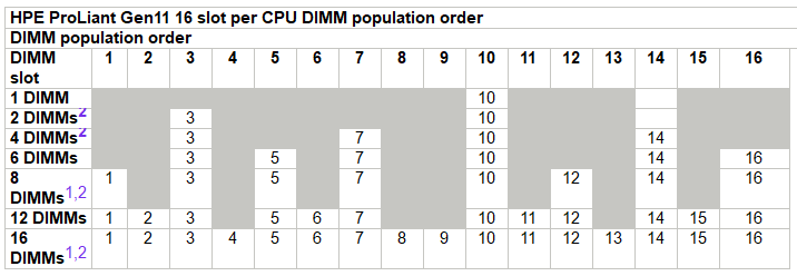 در تصویر زیر نحوه چیدمان رمها در اسلاتها، براساس تعداد رمها مشخص شده است. به طور مثال در صورتی که قصد داریم سه رم را به سروری با یک cpu متصل کنیم، باید آنها را در اسلاتهای 8، 10 و 12 جایگذاری کنیم. دقت کنید که این شکل شرایط نصب رم را برای یک cpu توضیح میدهد. بنابراین براساس اصل «توازن رمها در cpuها» اگر شش رم برای دو cpu داشته باشیم، باید آنها را در اسلاتهای 8، 10 و 12 مربوط به هر دو cpu جایگذاری کنیم.