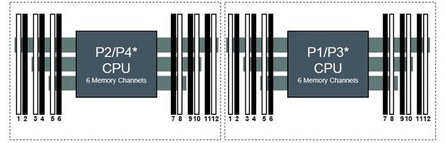 در تصویر زیر معماری رم سرور DL380 g10 را مشاهده میکنید. همانطور که میبینید این سرور DL380 g10 از دو پردازنده پشتیبانی میکند و به ازای هر پردازنده، شش کانال وجود دارد که هر کدام از کانالها دارای دو شکاف dimm هستند. در چیدمان رمها باید به حفظ تعادل dimmها دقت کنید.