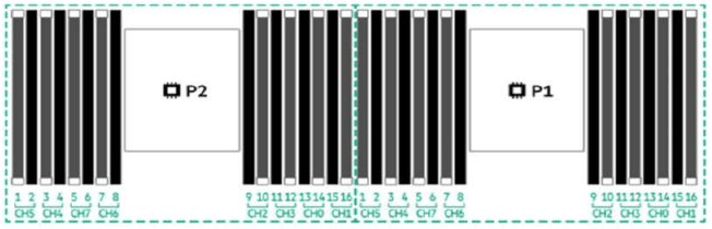در تصویر زیر معماری رم سرور DL380 g10 plus را مشاهده میکنید. همانطور که میبینید سرور DL380 g10 plus از دو پردازنده پشتیبانی میکند و به ازای هر پردازنده، هشت کانال وجود دارد که هر کدام از کانالها دارای دو شکاف dimm هستند. در چیدمان رمها باید به حفظ تعادل dimmها دقت کنید.